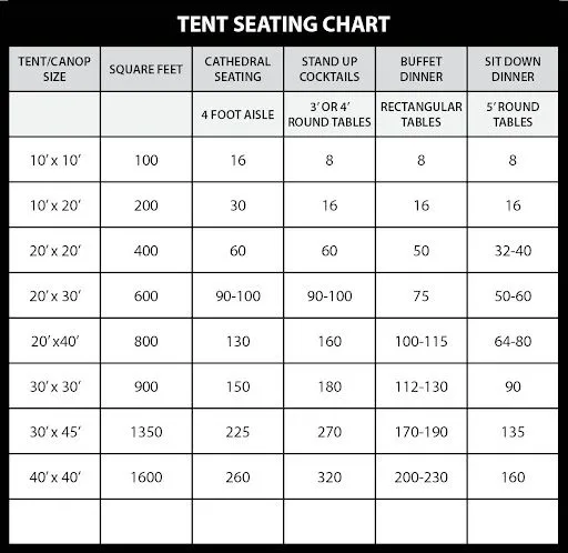 Lets walk through these questions to determine your size tent you will need. The Tent Seating Chart will give us a good starting point. This chart is assuming no dance floors, heaters, or large decorations will be undert the tent.